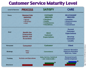 Simply put, there are three levels of service, each of which needs a strong foundation of the other. The first is the effective processing and handling of transactions, the second is the meeting of expectations and the third is about care, working to exceed expectations and build customer loyalty. Meeting expectations is fine but if someone finds it cheaper, they can be lost as customers.