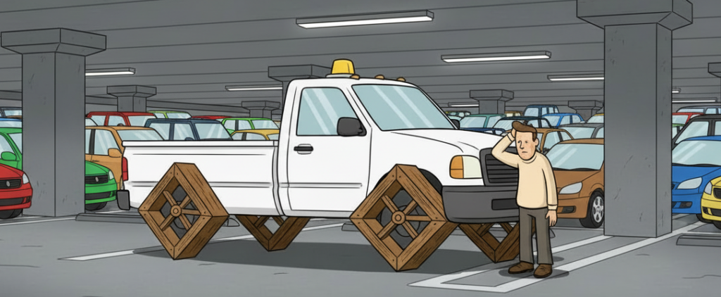 With a friend and parking for an art fair in a very large downtown Asheville, NC city-owned parking garage, we get back to my car only to find everything backed up and nothing moving. Maybe one car seemed to actually exit in the first 5 or 10 minutes. In front of us is a white truck with an amber spinning warning light (off) on the top, that I walk past as I stroll toward the front to see if I can find out anything…