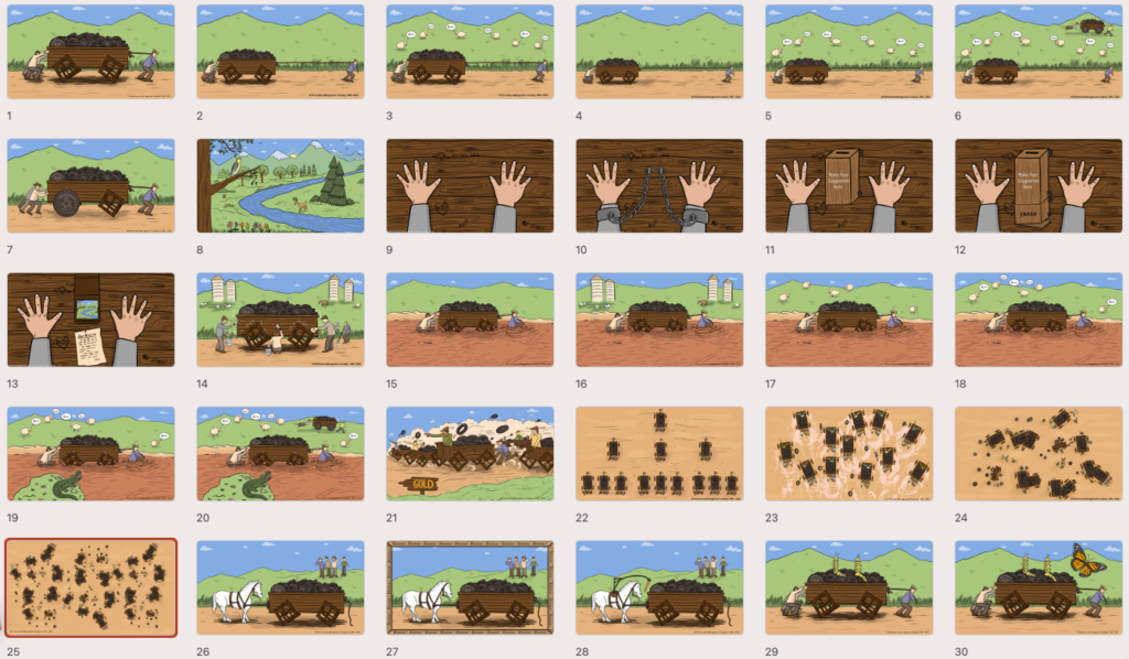 In my workshops across 49 countries, these images always pull more than 90% of participants into the conversation, generating dozens of specific observations and improvement ideas within minutes. The metaphors are simple, safe, and scalable: people project their reality onto the wagon, the Square Wheels, and the obvious unused round ones, and suddenly they are talking about culture, processes, leadership, and collaboration without feeling blamed or defensive.